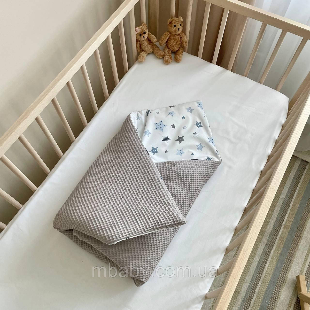 восторонній плед-конверт складається з тканини поплін і "вафля", всередині силіконізоване волокно. Трансформується у плед, зручно використовувати під час прогулянок у візочку. Утеплювач з'ємний.